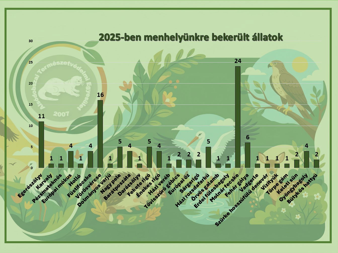 Lassan végére érünk a 2025-ös évnek, így számunkra is eljött az idő egy kis visszatekintésre. Menhelyünkön idén is fogadtuk a bajbajutott vadállatokat és igyekeztünk képességeink, és tudásunk legjava szerint gondoskodni róluk. A nálunk megfordult 114 egyed egy új esélyt kapott az életben maradáshoz. Legtöbbjüknek sikerült visszatérni a természetbe, néhányuknak azonban már sajnos ez nem adatott meg. A mellékelt két grafika igyekszik összefoglalni ez irányú idei tevékenységünket. Jövőre folytatjuk, és további fejlesztésekkel készülünk az állatmentés terén!